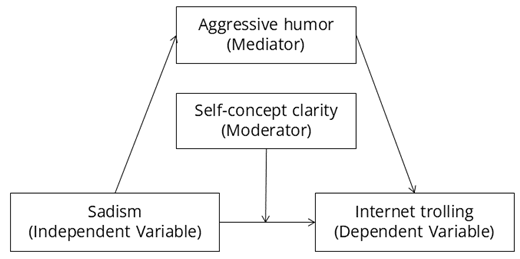 Overall, our hypotheses were partially supported: sadism positively predicted Internet trolling (H1 was supported), and aggressive humor mediating that impact (H2 supported). We also found that self-concept clarity moderated the direct relationship between sadism and Internet trolling, but this finding was opposite our H3: the positive association was stronger at high than at low levels of self-concept clarity.