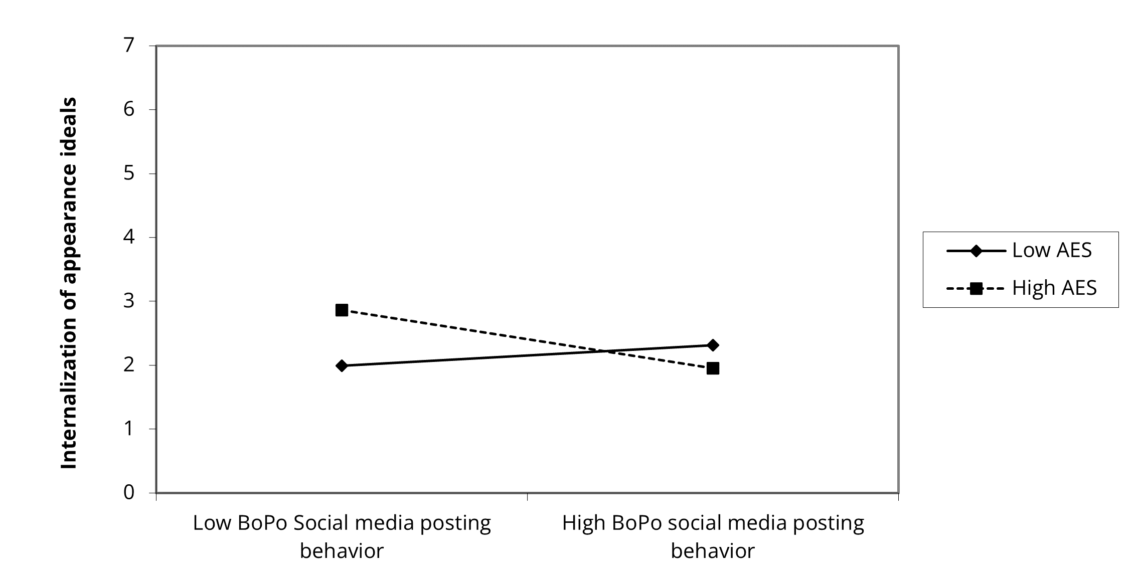 However, in terms of the direction of the moderation, puzzling findings emerged. A negative association occurred between BoPo social media content posting behaviors and internalization of appearance ideals, but only among individuals with high AES. This finding has some theoretical and practical implications. Research in the field of social media and body image often focuses on the moderating roles of certain susceptibility factors such as sex (Holland & Tiggemann, 2016; Vandenbosch et al., 2022). Yet, this study recommends future research to also consider dispositional susceptibility factors such as AES or other personality traits to truly capture which types of individuals may be most susceptible to experiencing positive or negative body image components related to their interactions with body-focused social media content. Additionally, given that negative associations emerged between BoPo social media posting behaviors and internalization of appearance ideals among high AES adolescents, AES may be considered as a buffer for negative effects. Yet, to support this reasoning, future experimental or longitudinal research that can examine causal relationships is needed to replicate these findings. If such research indeed reveals that AES is a protective factor for experiencing negative effects after posting BoPo content, interventions may be most powerful among specific subgroups of adolescents. When giving media literacy interventions in high schools, such programs may particularly address individual differences (e.g., adolescents with high AES) and may learn these adolescents how to interact with content on social media to experience positive effects of their body image.