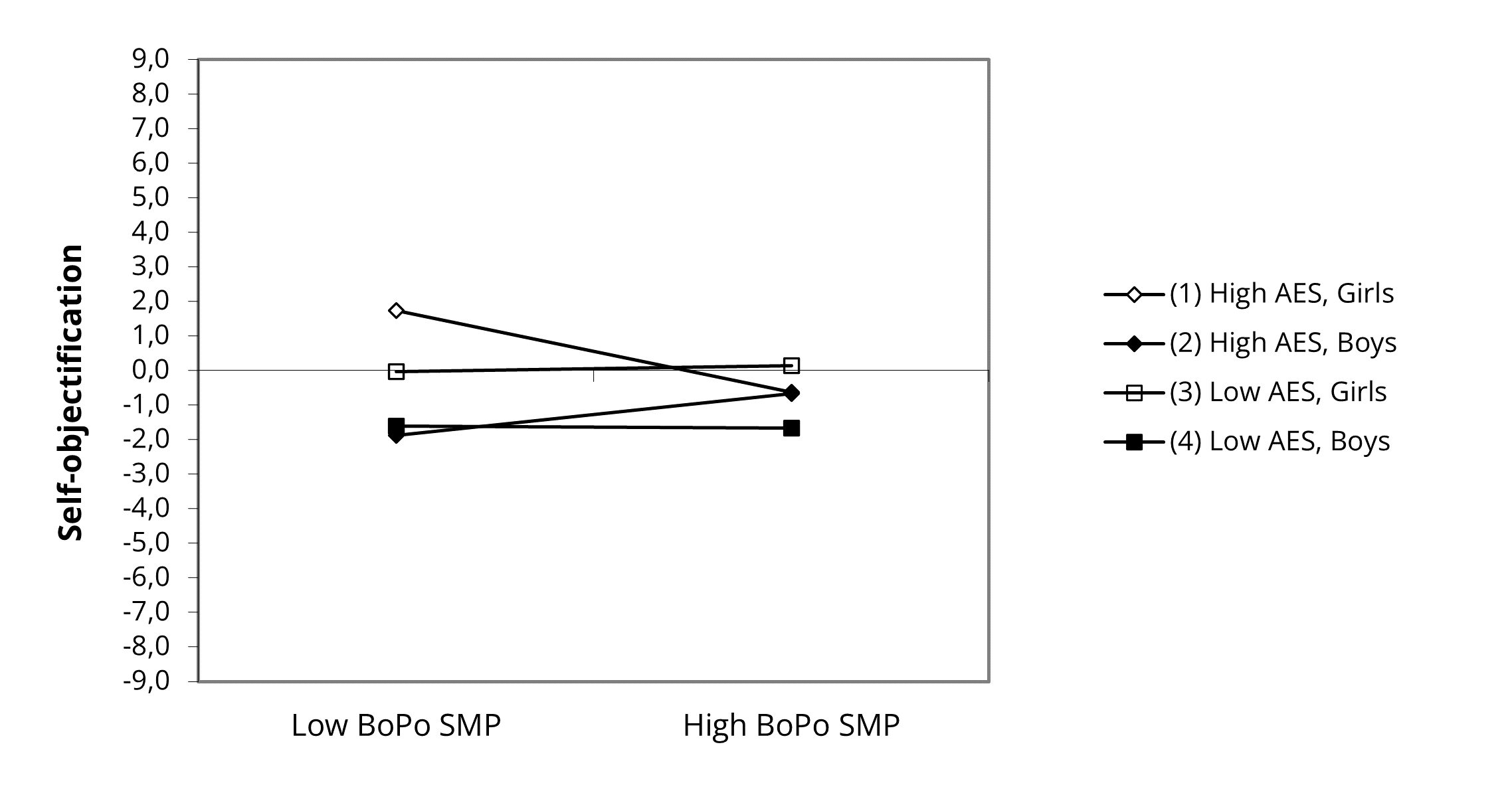 The finding of a three-way interaction between posting BoPo social media content, AES, and sex in users’ self-objectification suggests the importance of not merely considering a sole differential susceptibility factor like AES, but also a combination of AES with other factors, like sex, in social media and body image research. Future research is first needed to establish the causality of our research findings. If such studies reveal that certain groups are less likely to experience harmful effects of body-focused social media content, interventions that are established to protect adolescents from the harmful effects of such content may be most beneficial among these specific groups. This study thus highlights the importance of detecting such sensitivity groups in research and subsequently targeting such groups in interventions.