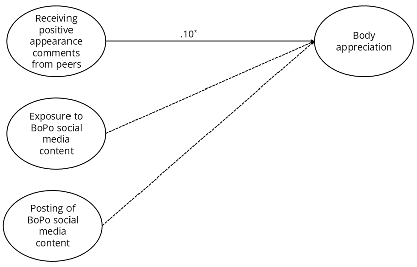 Furthermore, no significant associations between exposure to BoPo social media content and body appreciation were indicated, but such associations were found for receiving appearance comments from peers. Research may consider that exposure to BoPo social media content is less powerfully related to body appreciation than receiving comments on one’s appearance from peers. This may be related to the intended audience for the content. Whereas receiving appearance comments is targeted toward the adolescent and his/her own body, BoPo social media content involves other individuals’ bodies and promotes love toward “everyone’s” bodies. Potentially, the unique focus on one’s own body is necessary so that relations occur with a positive body image in users.