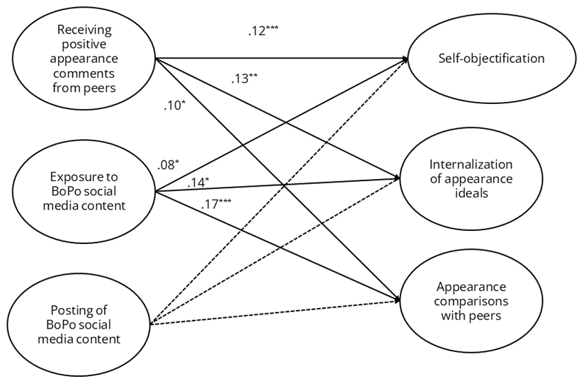 Third, no significant links to posting BoPo content on social media were observed when considering the overall sample. Three explanations may exist for these null findings. More precisely, adolescents who post BoPo content may receive positive appearance feedback from their peers on social media if they post specific messages (e.g., focus on natural appearance without make-up). Zero-order correlations indeed reveal a positive association between posting BoPo content and receiving positive appearance comments from peers. Such feedback may play a more pivotal role in shaping adolescents’ positive and negative body image components as compared to merely posting BoPo content. This reasoning aligns with prior research who also indicated that positive feedback from peers on social media can affect well-being outcomes (Valkenburg et al., 2006). This study can also partially confirm this reasoning; while positive appearance feedback from peers correlated with adolescents’ positive and body image outcomes, posting BoPo content did not. In addition, BoPo posting behaviors occurred relatively rarely; adolescents, on average, indicated to almost never post BoPo content. Potentially, these behaviors occurred not sufficiently enough to evoke meaningful relations in one’s body image development.