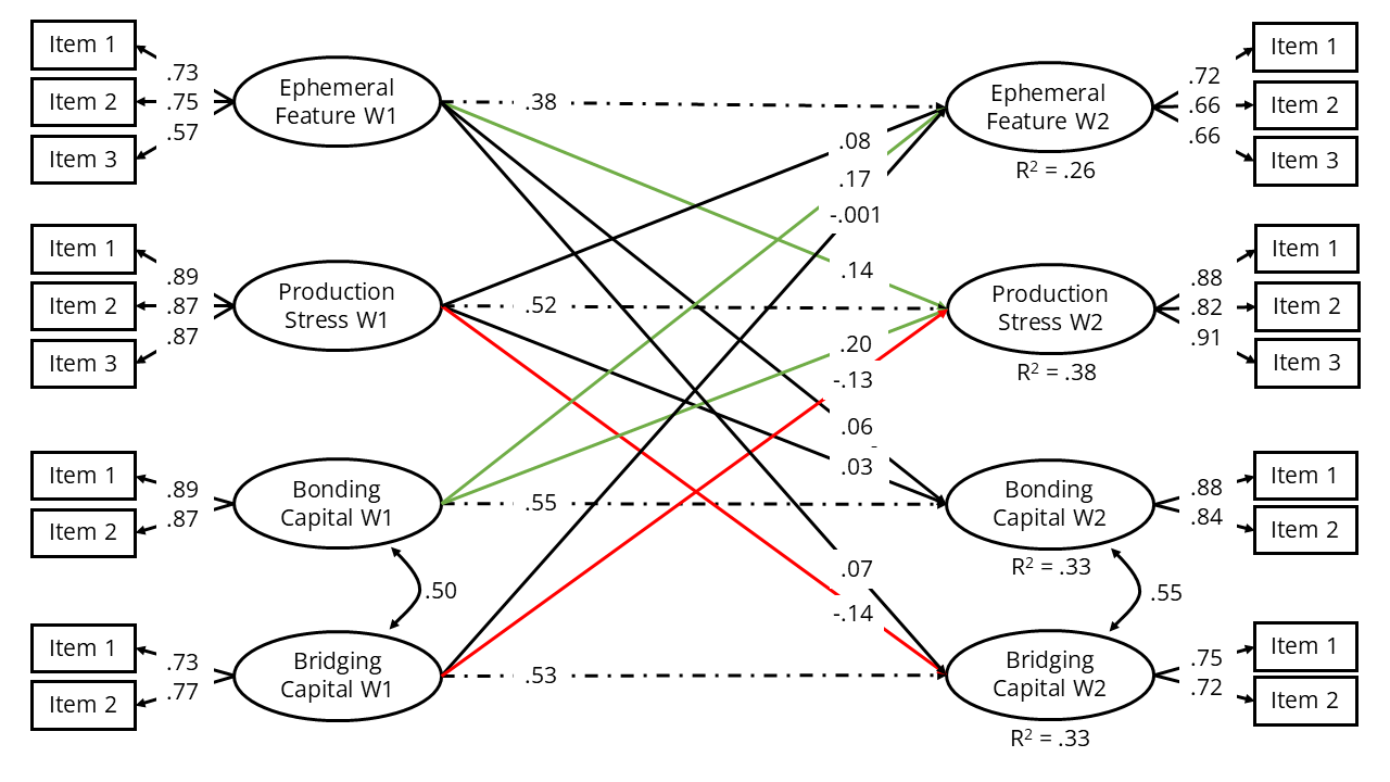 Concerning whether ephemeral feature engagement at W1 will positively predict production stress (H1), bonding capital (H2a), and bridging capital at W2 (H2b), SEM showed a significant path for production stress, b = .15, SE = 0.05, β = .14, p = .005, but neither for bonding capital, b = .06, SE = 0.06, β = .06, p = .297, nor for bridging capital, b = .06, SE = 0.05, β = .07, p = .297. In line with H1, stronger engagement with ephemeral features was linked to more severe production stress. We found no support for H2a and H2b.