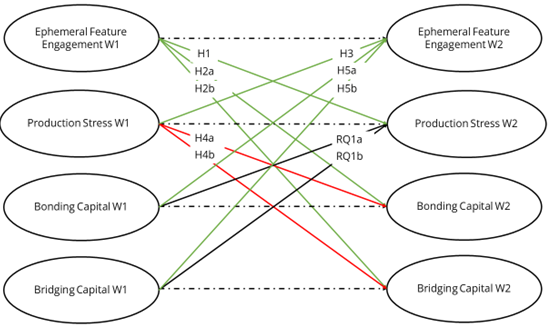 We further hypothesized that production stress at W1 will positively predict ephemeral feature engagement (H3) and negatively predict both bonding (H4a) and bridging capital at W2 (H4b). Indeed, findings documented a negative path for bridging capital, b = −.11, SE = 0.05, β = −.14, p = .029. No significant paths were found for ephemeral feature engagement, b = .08, SE = 0.07, β = .08, p = .261, or bonding capital, b = .03, SE = 0.06, β = .03, p = .637. Accordingly, more severe production stress was connected with lower bridging capital, but not with changes in participants’ engagement of ephemeral features or bonding capital. While our data supported H4b, it did not support H3 and H4a.We also assumed that both bonding (H5a) and bridging capital at W1 (H5a) will positively predict ephemeral feature engagement at W2. Results revealed a positive path for bonding capital, b = .16, SE = 0.07, β = .17, p = .032, but not for bridging capital, b = −.002, SE = 0.11, β = −.001, p = .987. In line with H5a, stronger bonding capital was associated with stronger engagement with ephemeral features over time. H5b was not supported.