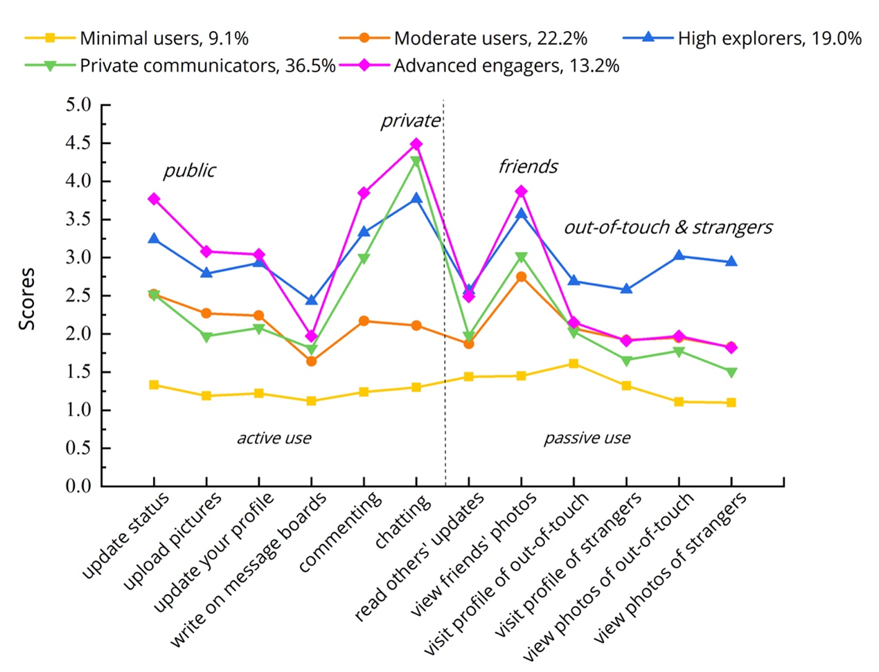 Profile 5, labeled Advanced engagers (13.2%), is characterized by the highest levels of both content contribution (e.g., status updating, uploading pictures) and interactive communication (e.g., commenting, chatting). In addition, these users primarily browse content from their friends rather than that from non-friends. Compared to Profiles 3, Profile 5 reported slightly higher mean scores on indicators of active use and lower scores on browsing content outside their networks. These users were therefore named "Advanced engagers".