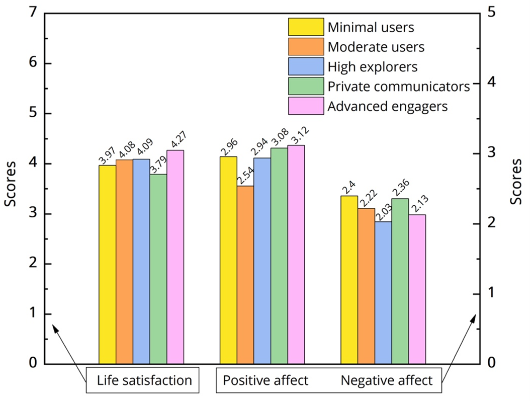 On the other hand, Moderate users and High explorers reported relatively higher levels of negative affect. A plausible explanation lies in their moderate to high engagement in passive content consumption, particularly for High explorers who frequently browse content from strangers or distant contacts. This finding supported the passive SNS use hypothesis, which suggests that increased time spent in passive browsing, especially exposure to idealized content from unfamiliar individuals, may increase the risk of negative social comparison and evoke more negative emotions (Verduyn et al., 2015). While the correlational nature of this study precludes us from causal inferences, future research is encouraged to examine the underlying mechanisms using longitudinal or experimental designs.