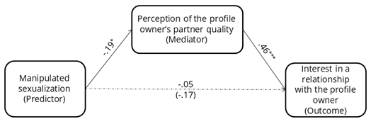 Another limitation concerns the lack of contextual information about the type of dating platform participants believed they were using (e.g., oriented toward long-term relationships vs. casual sex) and the absence of measures of participants’ baseline relationship goals. These omissions precluded analyses of whether such goals moderated the observed effects. Indeed, while unwanted sexualization may lead to dehumanization and cause severe harm (e.g., Liss et al., 2011; Ramsey et al., 2017; Ward, 2016), in some contexts and on certain dating platforms, sexualization may be normative and even desired (e.g., Daniels et al., 2022). In such cases, sexualization can serve as an explicit self-presentation strategy aligned with users’ relational goals. Conversely, people seeking long-term partners may be more sensitive to cues they interpret as warning signals, potentially heightening their criticism of sexualized profile owners.