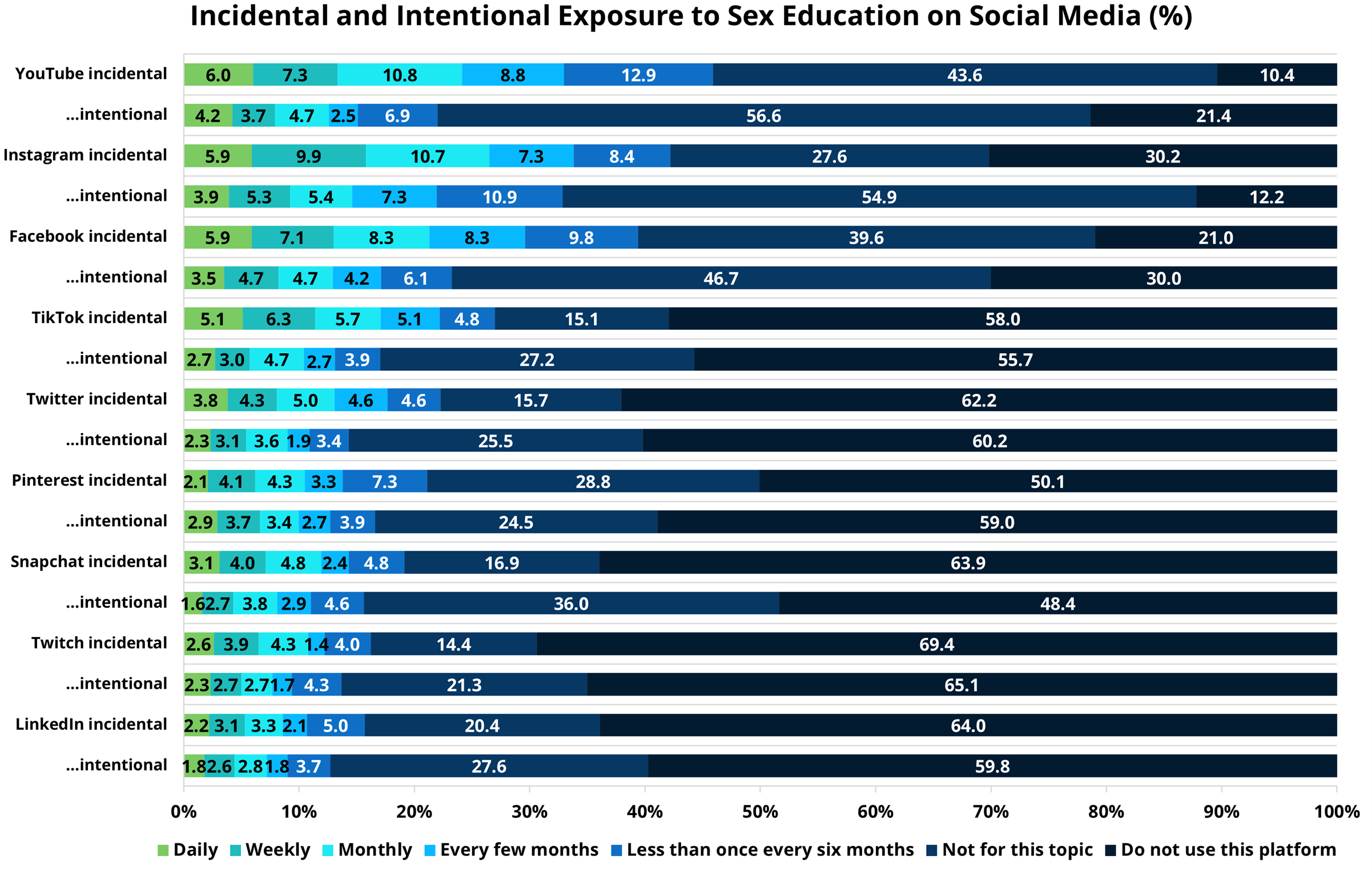 According to previous research, younger individuals are more likely to be exposed to sexual education than older individuals (Behre, 2022). This increased exposure may be due to a greater emphasis on promoting sexual health literacy among younger generations (Graf & Patrick, 2015), given their critical stage of sexual development, particularly during adolescence. With social media readily accessible, it is essential to investigate the extent to which exposure to sexual education occurs intentionally or incidentally (cf. White et al., 2023).