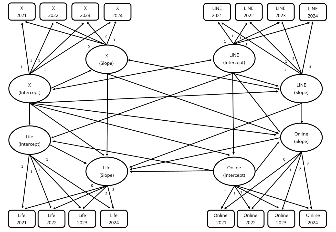 To analyze the complex and dynamic interplay between social media use, online relationships, and life satisfaction, this study investigated both (1) the direct relationship between X and LINE use and life satisfaction, and (2) the indirect relationship between X and LINE use and life satisfaction, mediated by the quality of online relationships. Understanding this dynamic requires considering how these factors evolve over time. While cross-sectional studies provide valuable insights, they are limited in their ability to capture the complex, temporal changes in these relationships (Wang & Cheng, 2020). Therefore, this study employed both cross-sectional and longitudinal analyses to offer a more comprehensive understanding of the momentary and developmental interconnections between social media use, online relationships, and life satisfaction.