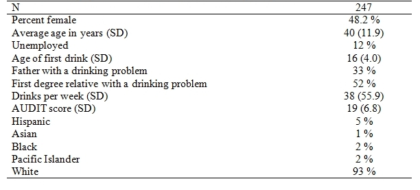 Between December 2005 and May 2006 283 subjects completed the program. Demographic and clinical characteristics of the sample are described in Table 1. The level of alcohol consumption and pathology was high. The mean AUDIT score was 19, and the number of drinks per week was 38. Nevertheless, only 12% of the sample was unemployed. Slightly more than half of the participants had a first degree relative with a known drinking problem.