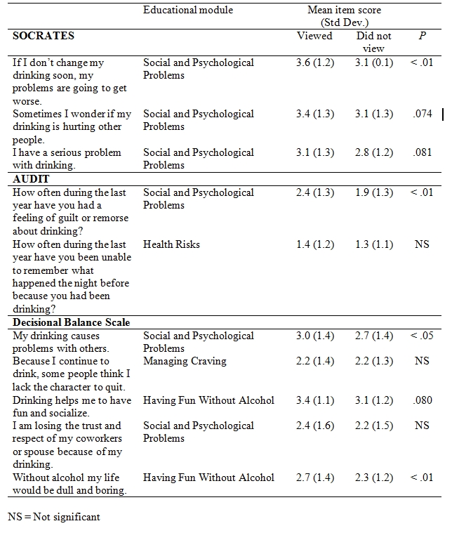 Results: Statistically significant associations were found between some of the item scores and module viewing. In general, subjects who viewed a specific educational module more strongly endorsed the putatively related questionnaire items.