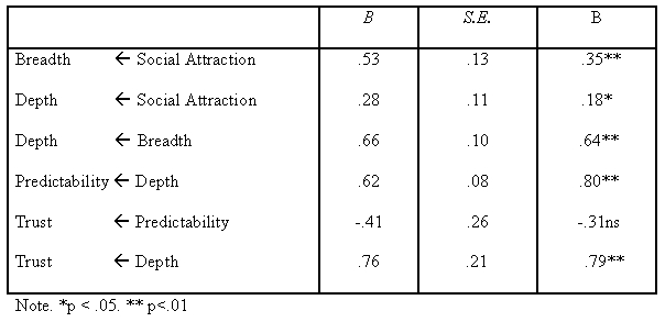 The Chi-square/df ratio was 1.56. For a model with a good fit, most empirical analyses suggest that the ratio of chi-square normalized to the degree of freedom should not exceed 3.0 (Tabachnick & Fidell, 1996). In addition, the comparative fit index (CFI) was .94, and the Tucker-Lewis (TLI) index was .93. The indices were well above the .90 benchmark (Hair, Black, Babin, Anderson, & Tatham, 1998). The Root Mean Square Error of Approximation (RMSEA) was .06. In the case of RMSEA, values less than .05 indicate a good fit, values as high as .08 represent reasonable, and values ranging from .08 to .10 indicate a mediocre fit (Byrne, 2001). Therefore, the results indicate the hypothesized model was a good fit. Table 1 represents the significance of path coefficients for all variables in the model. All paths were significant (p < .05). However, our goal was to examine the strength of the relationships between social attraction, self-disclosure, predictability and trust, so we could compare them with model 2 in which self-disclosure leads to social attraction.