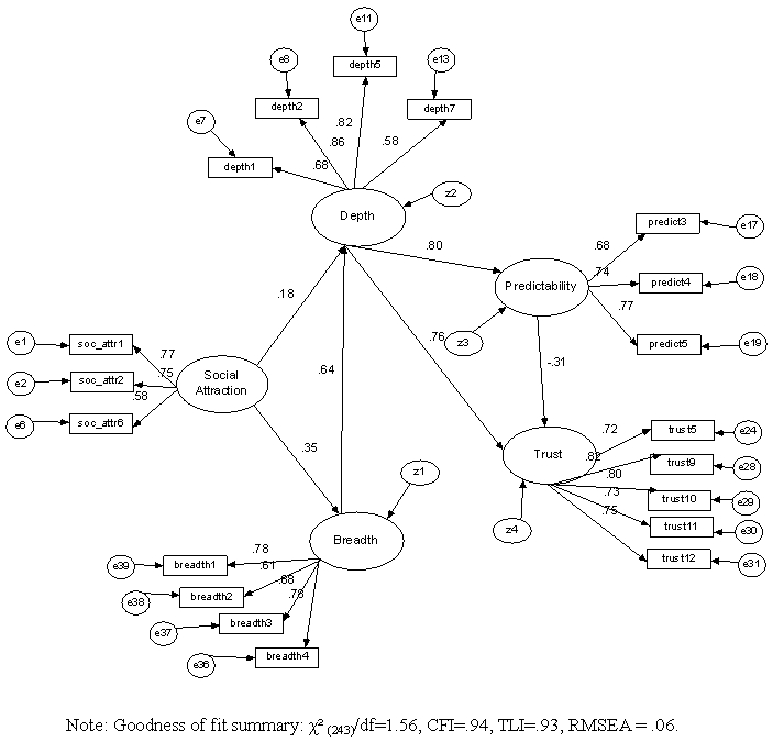 We conducted a confirmatory factor analysis (CFA) with four variables (self-disclosure, social attraction, predictability, and trust). Although the EFA gives an idea of dimensionality, CFA, as the name implies, essentially focuses on whether a hypothesized factor model does or does not fit the data. Thus, CFA is a commonly accepted method to test/confirm dimensionality (Netemeyer, Bearden, & Sharma, 2003). Because there is no single universally accepted fit index, a variety of indices were used to provide a comprehensive indication of fit.