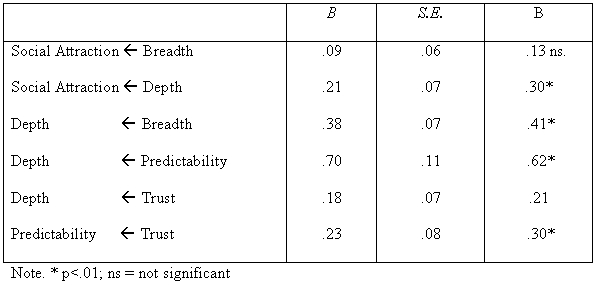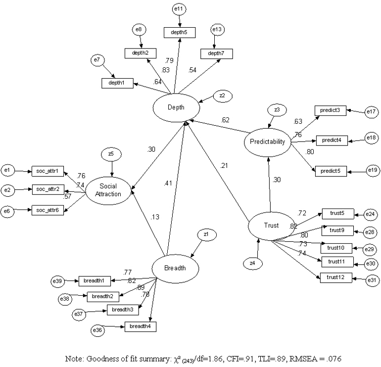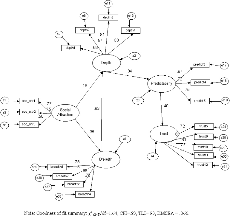 Our RQ1 asked how much the perception of attraction influences self-disclosure and how much the self-disclosure influences attraction. In a first model, social attraction influences self-disclosure, and self-disclosure leads to a greater predictability and trust. Breadth influences the depth of self-disclosure (Altman & Taylor, 1987). We tested what Craig et al. (2007), Kim, Lee and Park (2006), and Ramirez et al. (2002) would have suggested. Again, we employed AMOS 16.0, a covariance-based tool. Results (Figure 1) showed a good model fit.