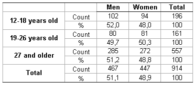 The presented research was realized by the survey, which is part of the wider framework of the World Internet Project: Czech Republic 2007. Data of the survey was collected by face-to-face structured interviews. The respondents were asked to select the appropriate answer for our created questions related to the respondents' lying online. The original selection sample included 1692 individuals of 12 and older, and is representative for the Czech Republic by the criteria of gender, education, age, region and domicile of the respondent. Of this sample, we have selected those who have answered positively to the question “Do you personally use the internet, meaning web sites, e-mail or any other part of the internet at home or any other location?” The results were elaborated for 914 users of the Czech internet, which form 54% of the original sample. Of these respondents, we have selected for in-depth analyses those who positively answered to the question: “Sometimes people lie on the internet. Have you told anyone a lie on the internet in the last 6 months?” We have also asked the respondents: “Who have you most often lied to? To a man, woman, or everyone in the appropriate environment?” For measuring the level of occurrence of various subjects of lies, we have asked about lying in each of the various communication environments separately. The environments were: e-mail, chat, discussion forums, IM, computer games. The list of chosen subjects included: age, gender, work, education, income, physical appearance. The results were compared for men and women as well as for the age groups of adolescence (12-18), emerging adulthood (19-26) and adulthood (27 and older). The number of men and women in individual age categories is listed in Table 1.