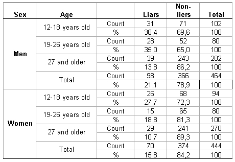 Table 2: Frequencies and percents of liars for individual age groups by gender.