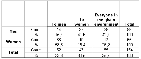 It is noticeable that men lie most often to women, or eventually that their lie has a “global character”, or in other words is not addressed to any individual but rather everyone present in a given environment (Table 3). Women admit lying to individuals of the opposite gender in a similar frequency, however they do not tend to make “global lies” as often and have approximately only half the frequency of men in this respect, χ2 (d.f.= 2) = 31,634; p < 0,001. This trend can be seen in every age group in our study. Hypothesis H2 has also been confirmed. Lying to the other gender is many times more frequent than lying to the same gender.