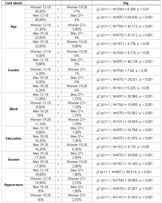 Our results indicate that approximately 18% of internet users list untrue information about themselves, of that 21% are men and 15.8% are women, χ2 (d.f.= 1) = 4,122; p < 0,05. Relatively large differences can be seen in various age groups, see table 2, χ2 (d.f.= 2) = 36,152; p < 0,001. About one third of users below 26 years of age admit lying on the internet, whereas the ratio is much lower for adults (12.3%) and notable differences can be seen between the groups of adolescents and adults, χ2 (d.f.= 1) = 29,193; p < 0,001, as well as the groups of young adults and users aged 27 and over, χ2 (d.f.= 1) = 20,596; p < 0,001. Hypothesis H1 – that younger users would lie more often than older ones – has thus been confirmed. Men aged 19-26 years are an exception, since they lied more often than boys ages 12-18.
