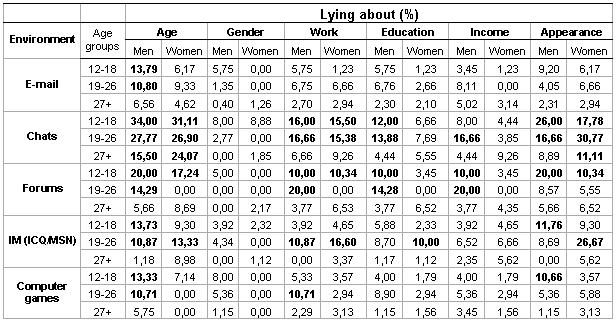 Table 5: Percentages of lying in various environments of the internet in relation to various subjects of lies, gender and age groups.